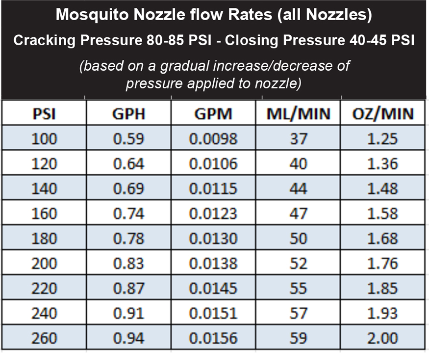 All Steinen mosquito nozzles have the same flow rates, despite the nozzle body style. Additionally, ALL nozzles offered in either high (standard) or low pressure versions, and in either 70˚ (standard) or 80˚ spray angles. Three types of mosquito misting spray nozzles are available.